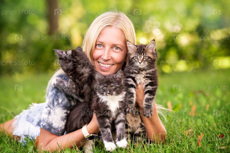 Очаровательная блондинка играет с маленькими котятами в теплый и солнечный летний день