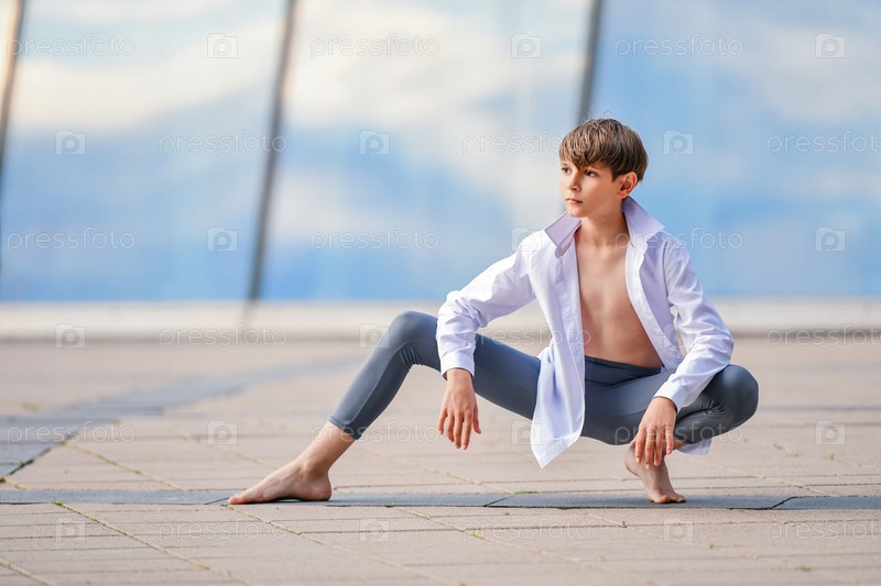 Портрет балетного мальчика, тренирующегося на фоне отражения неба в стеклянной стене