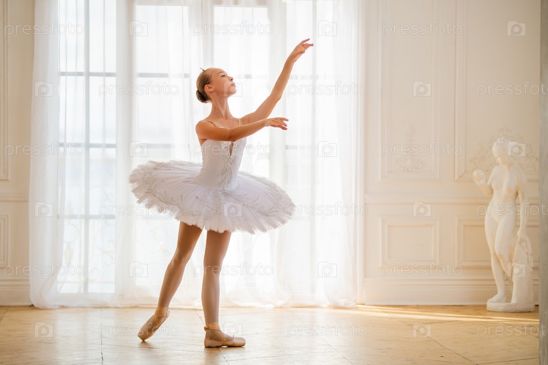 Молодая стройная балерина в белой пачке стоит в арабеске на пуантах в красивой белой комнате напротив окна
