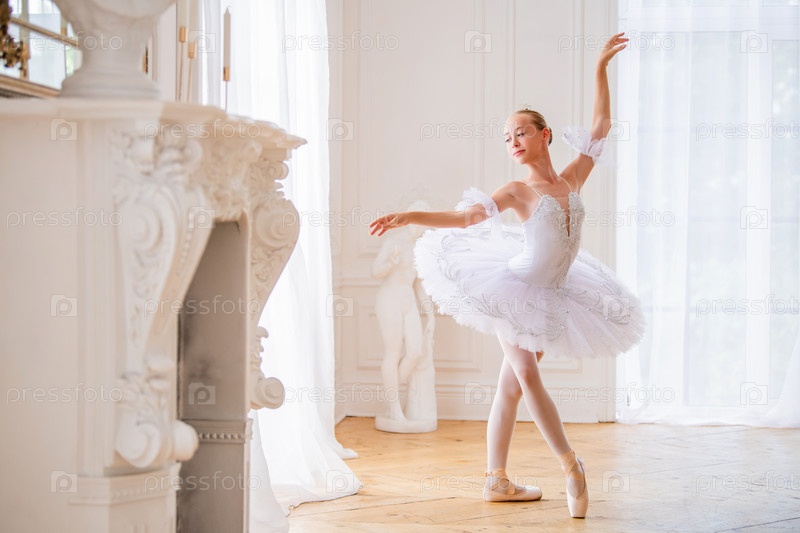 Молодая стройная балерина в белой пачке в пуантах танцует в большом красивом белом зале