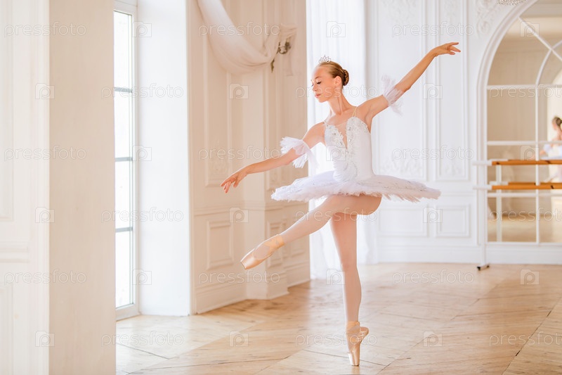 Молодая стройная балерина в белой пачке в пуантах танцует в большом красивом белом зале