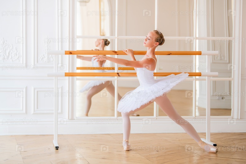 Молодая стройная балерина в белой пачке в пуантах танцует в большом красивом белом зале