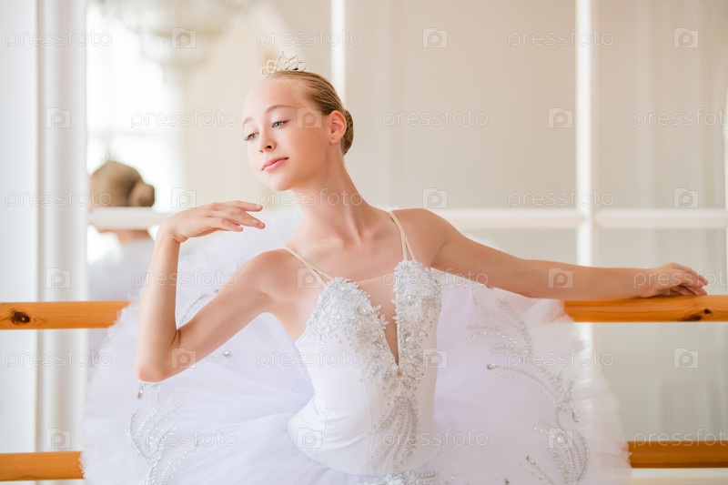 Портрет молодой балерины в красивой белой пачке возле балетного станка в большом красивом белом зале