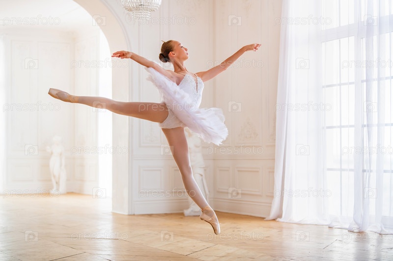 Юная стройная балерина в белой пачке на пуантах танцует в большом красивом белом зале, паря в прыжке