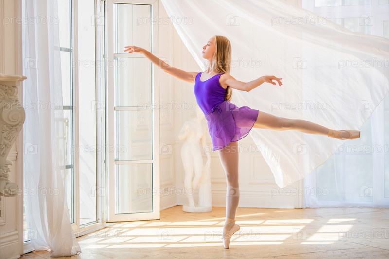 Юная стройная балерина в сиреневом трико стоит на пуантах в красивой белой комнате возле окна открытки, ветерок машет занавеской