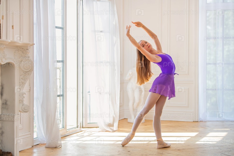 Юная стройная балерина в сиреневом трико стоит на пуантах в красивой белой комнате возле окна открытки, ветерок машет занавеской