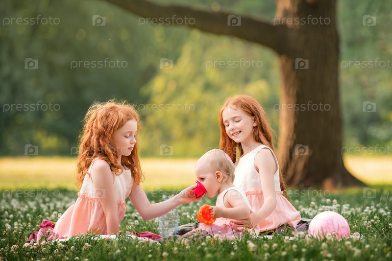 Три рыжеволосых кудрявых счастливых сестры играют в пикник на траве среди цветов белого клевера