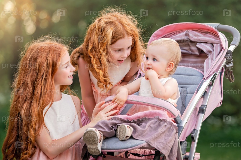 Две старшие рыжие сестры гуляют в парке в солнечный летний день с коляской со своей младшей сестрой. Девочки пытаются успокоить жуткую девочку, у которой режутся зубки