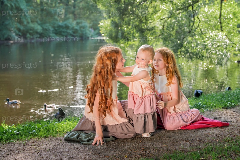 Три рыжеволосые сестры в длинных льняных платьях пускают мыльные пузыри в парке в солнечный летний день