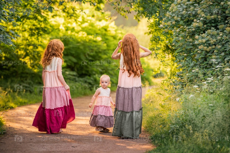 Три рыжеволосых девушки в длинных платьях бегут босиком по дорожке в парке навстречу закату