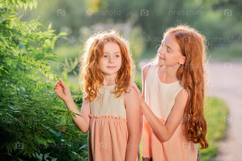 Две рыжие сестры в длинных льняных платьях гуляют по парку в солнечный летний день