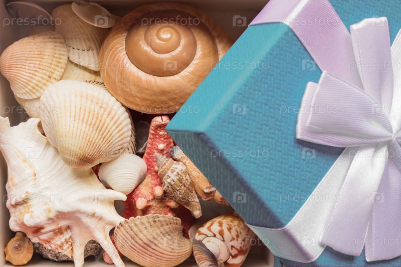 Синяя подарочная коробка с белым бантом, полным морских раковин. тропический отдых по концепции зимнего сезона