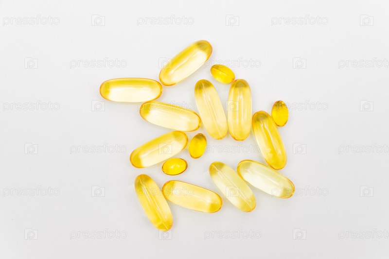 Рыбий жир и капсулы D3 на белом фоне, витаминная добавка, вид сверху с копией пространства