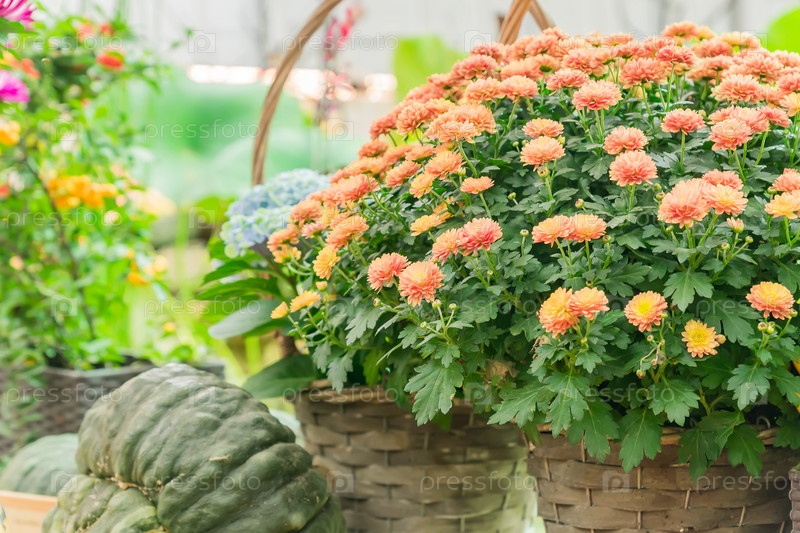 Цветущий куст оранжевой хризантемы в плетеной корзине. Осенние цветы