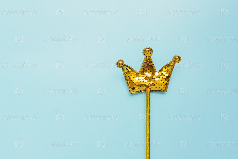 Золотая волшебная палочка из блесток в форме короны на пастельно-голубом фоне. Креативная квартира в минималистичном стиле