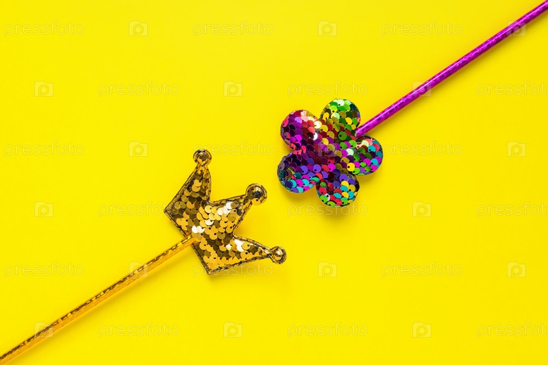 Золотая корона и розовый цветок из круглых блесток на желтом фоне. Модные аксессуары для вечеринок с копией пространства. Праздничная плоская планировка. Минимальный стиль