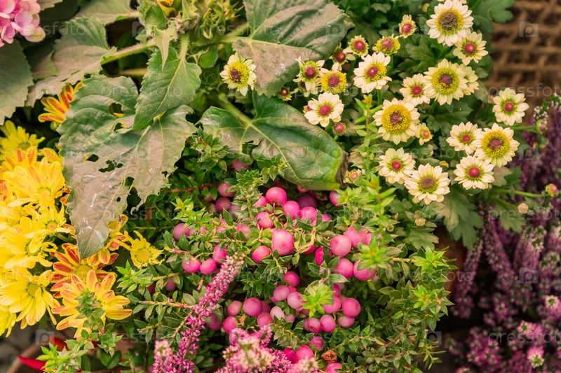Осенняя декоративная композиция - розовая лиственница, желтый хризантема, Pernettya mucronata, собранные вместе