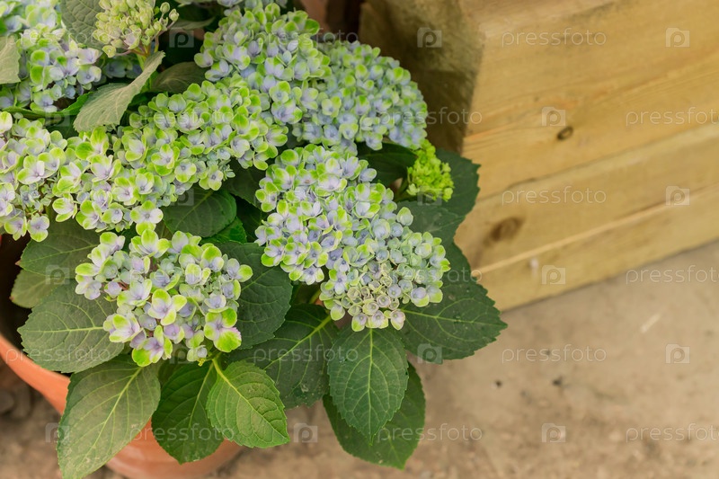 Красивые цветущие голубые цветы гортензии в глиняном горшке