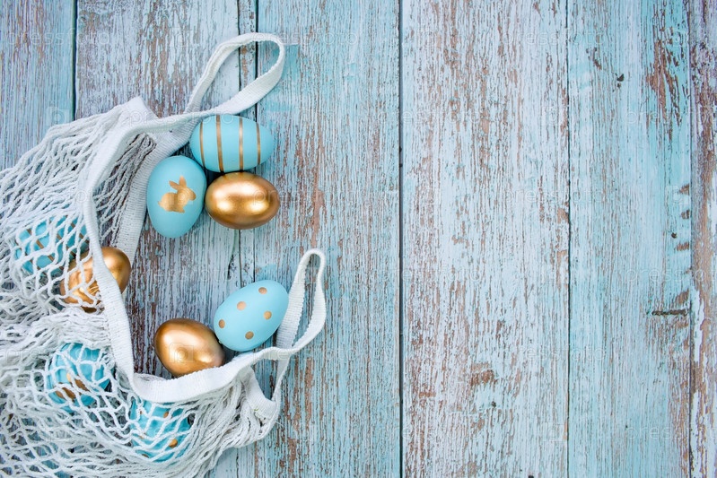 Золотые, черные, белые, синие яйца в авоське на синем деревянном фоне. Геометрия. Минимальная концепция. Вид сверху. Пасхальная открытка с копией места для текста
