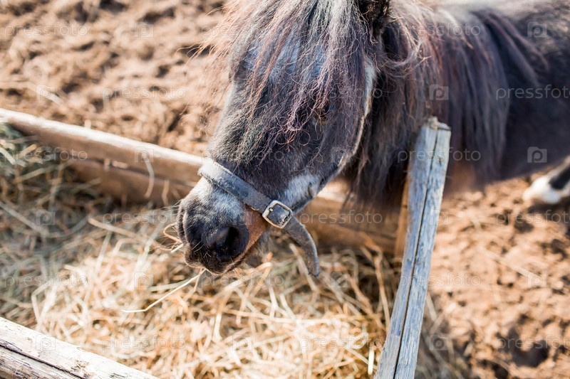 Порода декоративных карликовых лошадей. Милый маленький мини-пони на ферме. Крупный план портрета животного