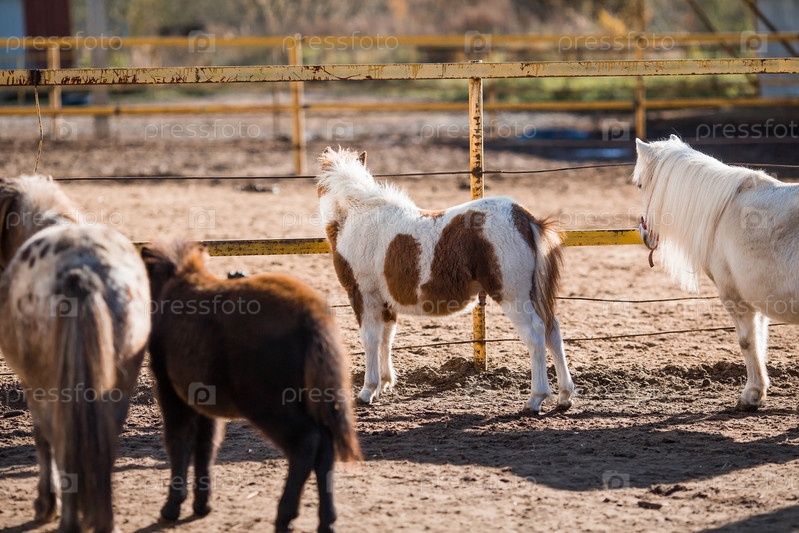 Порода декоративных карликовых лошадей. Милый маленький мини-пони на ферме. Крупный план портрета животного