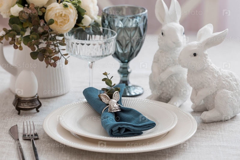 Красивая весенняя сервировка стола. Тарелка с хлопковой салфеткой с зайчиком. Столовое серебро и ваза с цветами на льняной скатерти. Концепция праздничной сервировки и яркого праздника Пасхи
