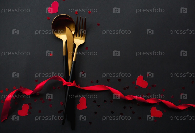 День святого Валентина. Набор столовых приборов с золотом на черном фоне