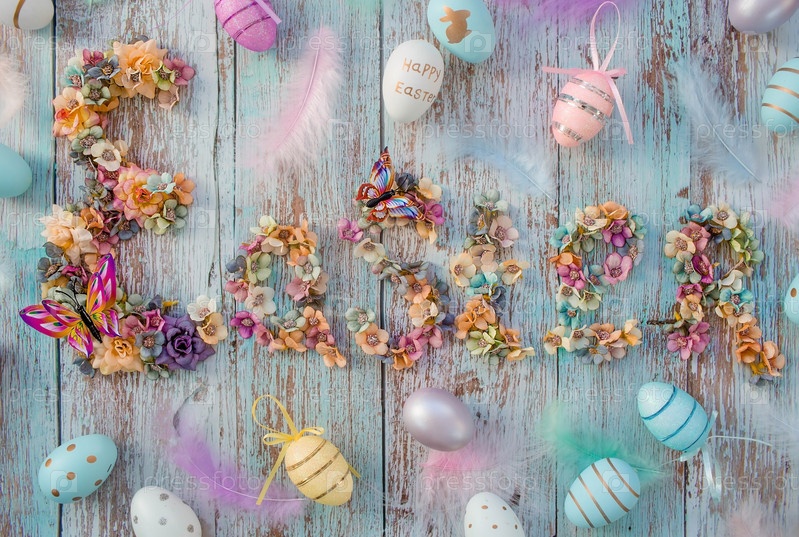 Баннер. Рамка пасхального яйца и слово из цветов на синем деревянном фоне. Минимальная концепция. Вид сверху. Карточка с копией места для текста