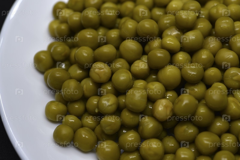 Консервированный горох на белой тарелке. Вкусный свежий горох