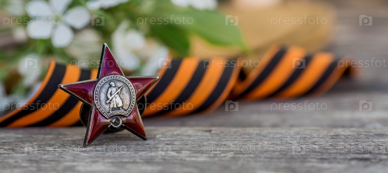 Георгиевская лента и орден Красной Звезды ветерана Великой Отечественной войны СССР на деревянном фоне. Перевод на русский язык: Рабочие всех стран объединяйтесь. Концепция праздника 9 мая