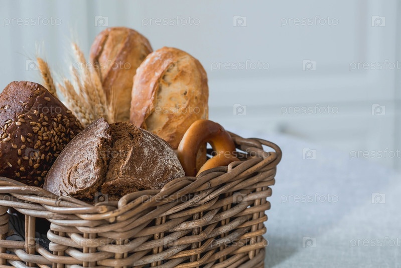 Ассортимент свежего хлеба в плетеной корзине крупным планом. Свежеиспеченный хлеб на столе. Контекст пекарни с вкусным хлебом. Кондитерские изделия