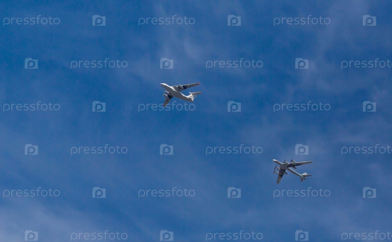 Репетиция Парада Победы. Группа военных самолетов на фоне голубого неба. Москва. Россия