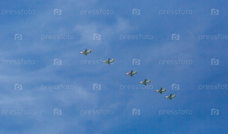 Репетиция Парада Победы. Группа военных самолетов на фоне голубого неба. Москва. Россия