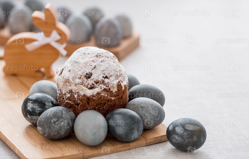 Стильные серые пасхальные яйца из мрамора и бетона и торт на деревянной подставке. Окрашивание яиц натуральным красителем каркаде чай. Экологичность. Естественность. Концепция счастливой Пасхи 2023 года