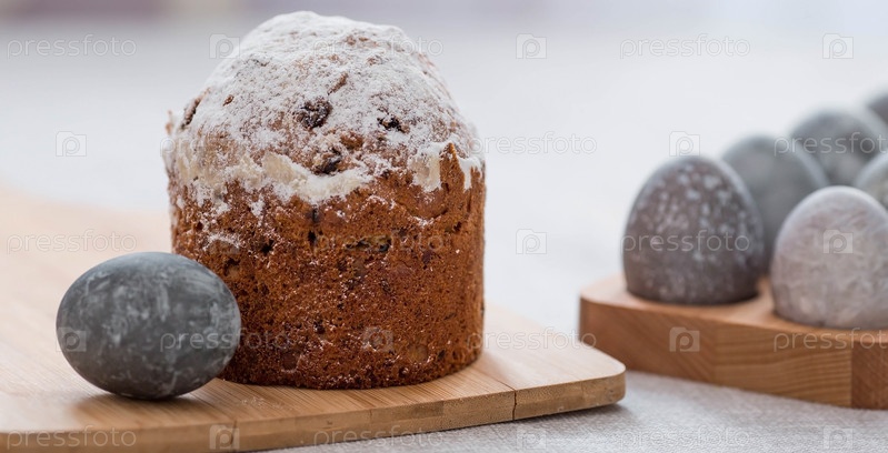 Стильные серые пасхальные яйца из мрамора и бетона и торт на деревянной подставке. Окрашивание яиц натуральным красителем каркаде чай. Экологичность. Естественность. Концепция счастливой Пасхи 2023 года