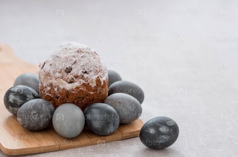 Стильные серые пасхальные яйца из мрамора и бетона и торт на деревянной подставке. Окрашивание яиц натуральным красителем каркаде чай. Экологичность. Естественность. Концепция счастливой Пасхи 2023 года