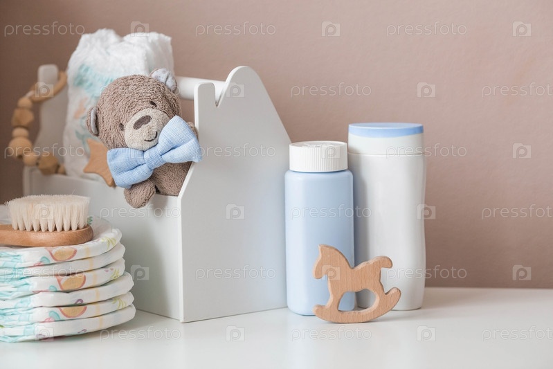 Деревянные игрушки, мишка в галстуке-бабочке, стопка подгузников, бутылочки без этикеток и детские принадлежности на пеленальном столике. Место для текста