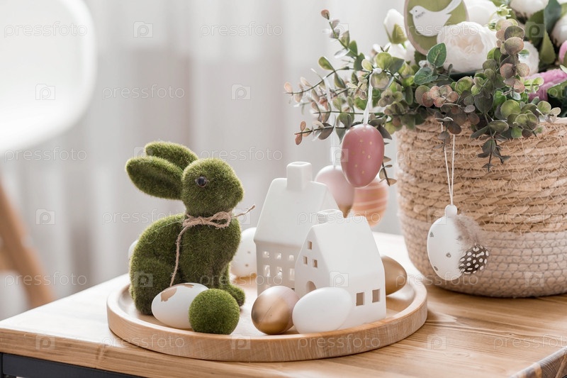 Красивая открытка. Концепция праздника Светлой Пасхи. Цветы, кролики, пасхальные яйца и скандинавские белые домики на деревянном столе в уютной гостиной