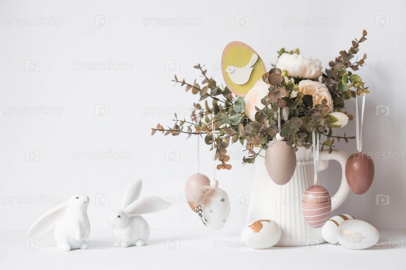 Красивая открытка. Баннер. Концепция светлого праздника Пасхи. Букет цветов, белые кролики и пасхальные яйца на белом изолированном фоне