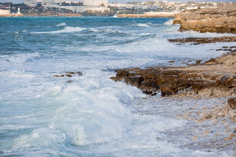 Красивый морской пейзаж. Черноморское побережье. Волны бьются о скалы. Россия, Крым