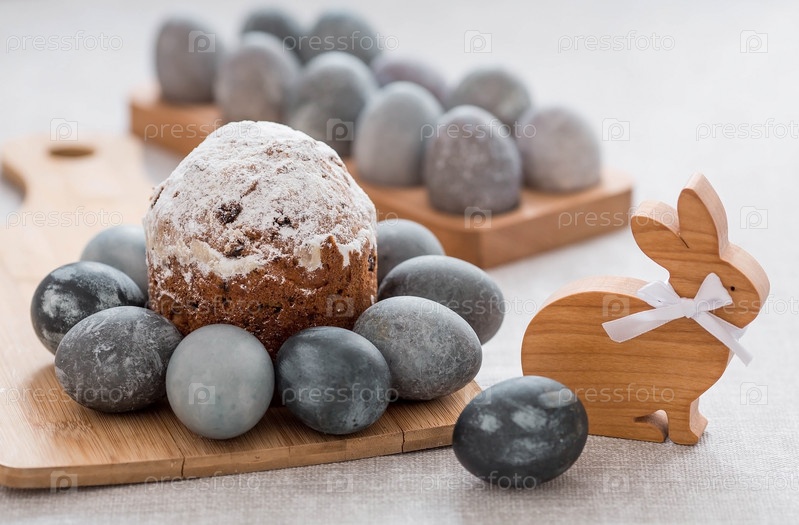 Стильные серые пасхальные яйца из мрамора и бетона и торт на деревянной подставке. Окрашивание яиц натуральным красителем каркаде чай. Экологичность. Естественность. Концепция счастливой Пасхи 2023 года
