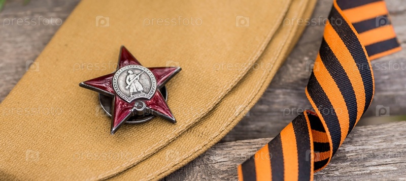 Георгиевская лента и орден Красной Звезды ветерана Великой Отечественной войны СССР на деревянном фоне. Перевод на русский язык: Рабочие всех стран объединяйтесь. Концепция праздника 9 мая