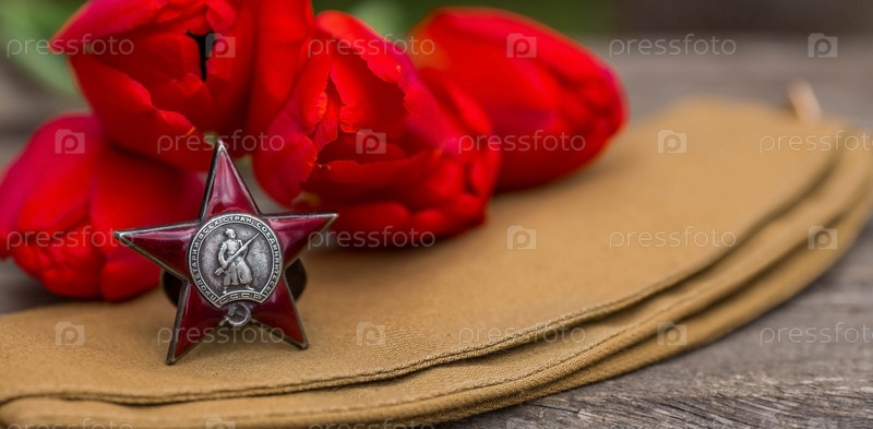 Георгиевская лента и орден Красной Звезды ветерана Великой Отечественной войны СССР на деревянном фоне. Перевод на русский язык: Рабочие всех стран объединяйтесь. Концепция праздника 9 мая