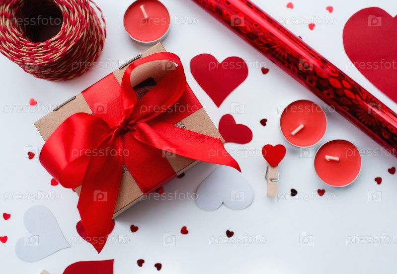 День Святого Валентина. Плоская композиция из красных войлочных сердец ручной работы и подарочных коробок на белом фоне. Скопируйте пространство