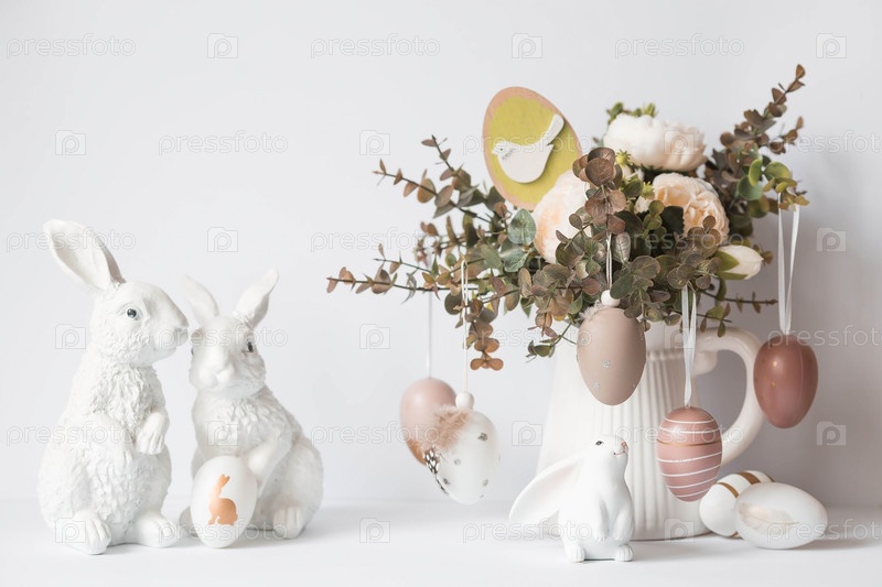 Красивая открытка. Баннер. Концепция светлого праздника Пасхи. Букет цветов, белые кролики и пасхальные яйца на белом изолированном фоне