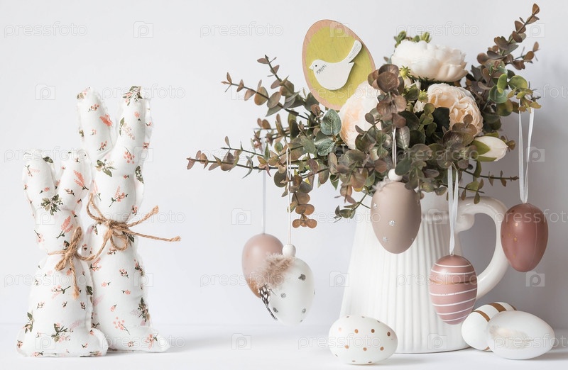 Красивая открытка. Баннер. Концепция светлого праздника Пасхи. Букет цветов, белые кролики и пасхальные яйца на белом изолированном фоне