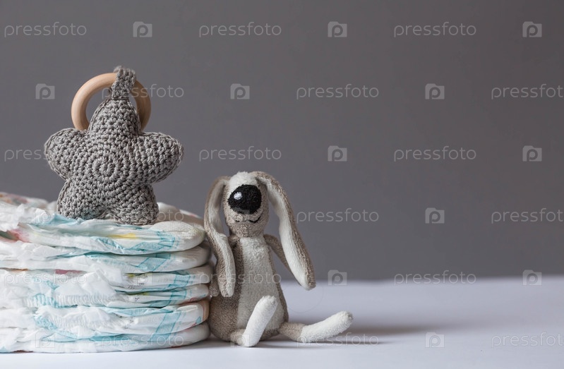 Стопка подгузников и мягких игрушек на пеленальном столике. Место для текста