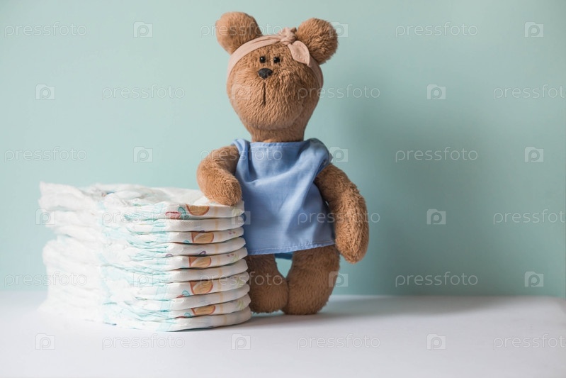 Стопка подгузников и плюшевый мишка на пеленальном столике. Любовь и забота о коже ребенка. Место для текста