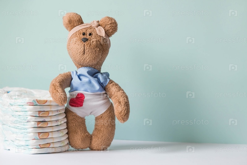 Стопка подгузников и плюшевый мишка в трусиках-подгузниках с сердечком на пеленальном столике. Любовь и забота о коже ребенка. Место для текста