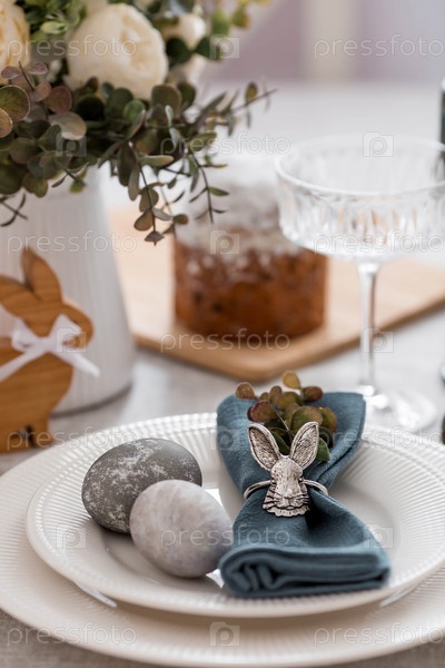 Весенняя сервировка стола. Тарелка с хлопковой салфеткой с зайчиком, тортом и пасхальными яйцами. Столовое серебро, пасхальные кролики и ваза с цветами на льняной скатерти. Концепция светлого праздника Пасхи